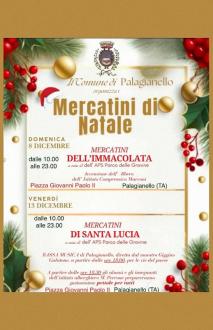 Il Comune di Palagianello , in collaborazione con l’Associazione Parco delle Gravine è felice di annunciare l'organizzazione dei tradizionali Mercatini di Natale, che si terranno Domenica 08 Dicembre e Venerdì 13 Dicembre e si estenderanno per l'intera giornata!
